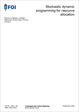 Resursallokering är en viktig del i det framtida nätverksbaserade försvaret. För att uppnå tillräckligt bra lägesbilder krävs det att sensorplattformar skickas till rätt ställen och att rätt prioriteringar görs mellan olika användares behov. Andra viktiga problem som kräver resursallokering är t ex att bestämma var soldater eller ambulanser ska placeras. För att ta hänsyn till motståndarens framtida aktivitet när sensorstyrning görs krävs noggrann konsekvens- och riskanalys. Ett viktigt hjälpmedel vid sådan analys är stokastisk optimering. En viktig metod för sådan optimering är stokastisk dynamisk programmering, som kan användas för att beräkna bästa möjliga handlingsalternativ när vi har probabilistisk kännedom om motståndarens uppträdande. Även i de fall där man har stokastiska modeller för t ex tillförlitlighet i våra kommunikationsnät kan stokastisk dynamisk programmering användas. I den här rapporten beskriver vi grunderna för stokastisk dynamisk programmering samt dess relation till reinforcement learning. Vi beskriver också kort några relevanta tillämpningar från litteraturen samt ger förslag på framtida arbete inom området.